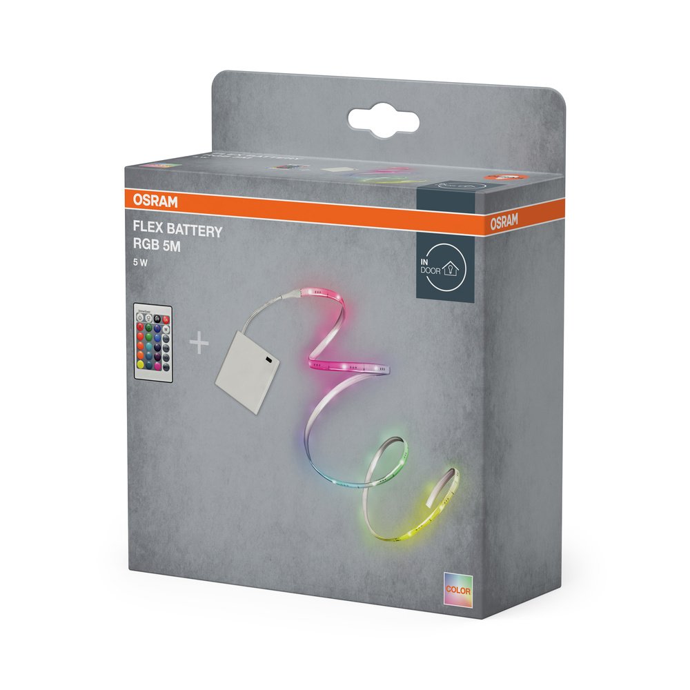 Farebné pásky Flex Strips na batérie na viacúčelové použitie | Ovládanie farieb RGB | Menovitý výkon: 5,00 W | Menovité napätie: 5 V | Vyžarovací uhol: 120 ° | Dĺžka (vrátane okrúhlych svietidiel): 5000,00 mm | Výška (vr. valc. svietidiel): 3,00 mm | Šírka (vrátane okrúhlych svietidiel): 10,00 mm | Stredná doba života L70/B50 @ 25 °C: 30000 h | Druh ochrany: IP20 | Trieda ochrany: III | Štandardy: CE / UKCA | Záruka: 2 roky