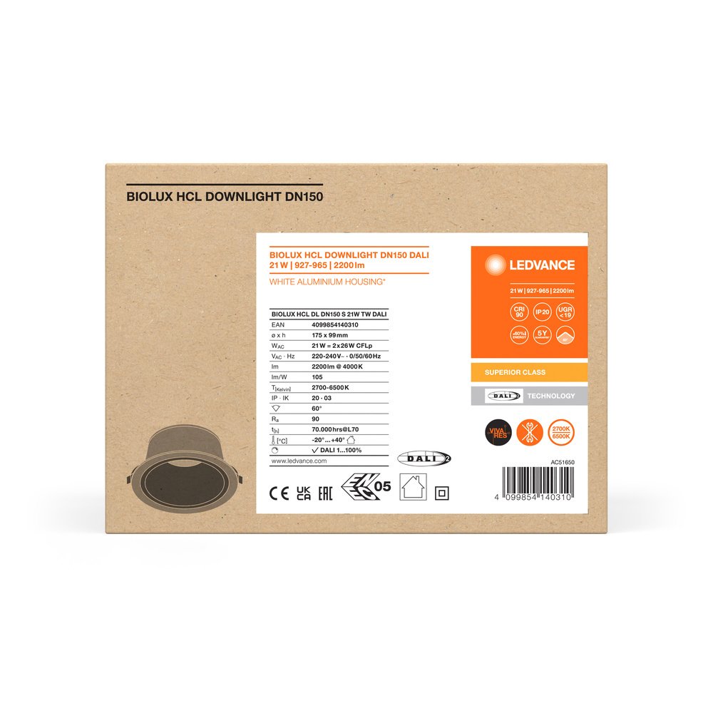 Downlight svietidlá, Tunable White, 105 lm/W, inštalácia bez rádia, technológia DALI-2 IoT. Vlastnosti výrobku: Svietidlo s funkciou DALI-2 pripravené na IoT. Nastaviteľná teplota chromatičnosti pomocou laditeľnej bielej: 2700…6500 K. Veľmi vysoký index podania farieb Ra: > 90. Vhodné pre núdzové inštalácie s centrálnou batériou podľa EN 60598-2-22. Výhody výrobku: Vhodné svietidlo na ovládanie svetla pomocou VIVARES DALI, VIVARES DALI HCL a DALI-2. Umožňuje individuálne riešenie osvetlenia Tunable White v kombinácii s kompatibilnými ovládačmi DALI-2. Kvalita svetla CRI 90 pre pohodovejšiu atmosféru v aplikáciách HCL. Sedemročná záruka na systém pri prevádzke v systéme VIVARES DALI. Kompatibilný s VIVARES CLOUD SERVICE na monitorovanie energie. Možnosť priechodného zapojenia pomocou priloženej káblovej svorky. Externý ovládač DALI2 pre flexibilnú a jednoduchú inštaláciu. Spoľahlivé zníženie oslnenia (UGR ≤19). Oblasti použitia: Priama náhrada za svietidlá s kompaktnými žiarivkami. Kancelárie, konferenčné miestnosti. Recepcia, vstupné haly a chodby. Výbava / príslušenstvo: Vrátane externého predradníka. Predinštalovaná káblová svorka pre priechodné vedenie.