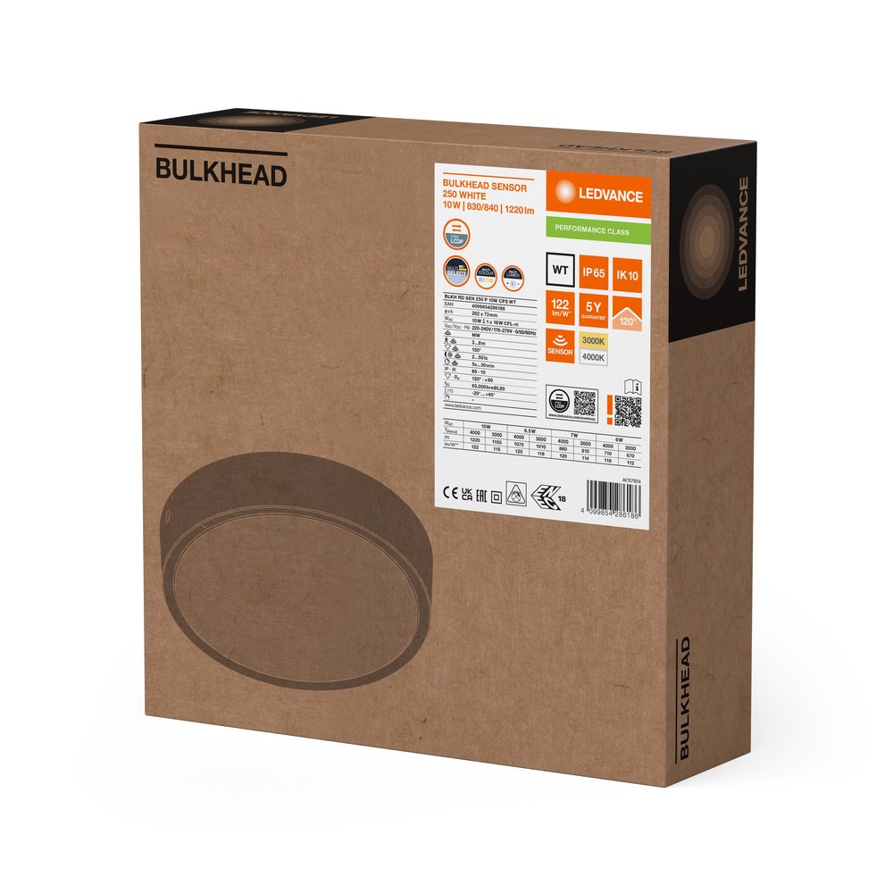 Robustné nástenné a stropné svietidlo s krytom IP65 a IK10 a senzorom. Vlastnosti výrobku: Vysokofrekvenčný senzor na detekciu denného svetla a pohybu. UV stabilizované polykarbonátové púzdro, polykarbonátový difúzor. Vysoká svetelná účinnosť: > 120 lm/W pre 3000 K a 4000 K. Odolnosť proti nárazu: IK10. Stupeň krytia: IP65. Tlačidlová svorkovnica umožňuje zapojenie bez náradia. Možnosť káblového pripojenia. Výhody výrobku: Viac možností upravenia senzora, detekcia denného svetla a doba držania. Vysoko univerzálna vďaka voliteľným CCT a stupňom výkonu (Multi Color / Multi Lumen) na driveri. Flexibilné montážne vzory na konvenčnú inštaláciu. Vhodné na použitie vo verejných priestoroch vďaka vysokej hodnote IK. Vhodné na použitie v prašných a vlhkých miestach vďaka vysokej hodnote IP. Vhodné na použitie v systéme núdzového osvetlenia (možnosť DC). K dispozícii je samostatný dekoračný prvok pre estetický a funkčný dizajn produktu. Oblasti použitia: Priama náhrada za svietidlá so žiarivými svetlami. Chodby, schodiská, zádverie. Chodby, podchody. Verejné priestory. Výbava / príslušenstvo: Dodatkové krycie krúžky v rôznom prevedení. Vrátane montážnych skrutiek a spojovacích kolíkov. Vrátane skrutiek proti krádeži. Bezpečnostné informácie: Všetky elektrické pripojenia musia spĺňať kvalifikovanú osobu.. Pozor – nebezpečenstvo úrazu elektrickým prúdom.