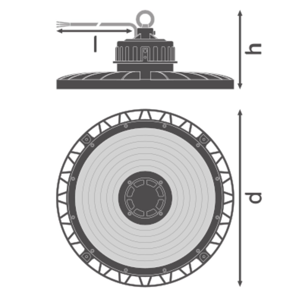 High-bay svietidlá až 15 lm/W a atraktívnym UGR. Vlastnosti výrobku: Rôzny svetelný tok a vyžarovací uhol pre montážne výšky 6 - 14 m: 4 000 K alebo 6 500 K. Výhody výrobku: Vylepšené UGR v porovnaní s predchádzajúcimi generáciami, v kombinácii s reflektorom UGR ≤ 22. Vysoký merný svetelný výkon. Úspora energie až 64% v porovnaní s bežnými výškovými svietidlami. 5-ročná záruka. Optimalizovaná hmotnosť a veľkosť kvôli kompaktnosti designu. Oblasti použitia: Náhrada za svietidlá „high bay“ s obsahom ortuti alebo halogenidovej výbojky. Sklady. Logistické haly. Priemysel. Vysoký strop (napr. nákupné centrá, komplexné objekty, haly). Výbava / príslušenstvo: Priložený je montážny háčik. Montážne prvky, reflektory a žiaruvzdorné prvky sú k dispozícii ako samostatné príslušenstvo.