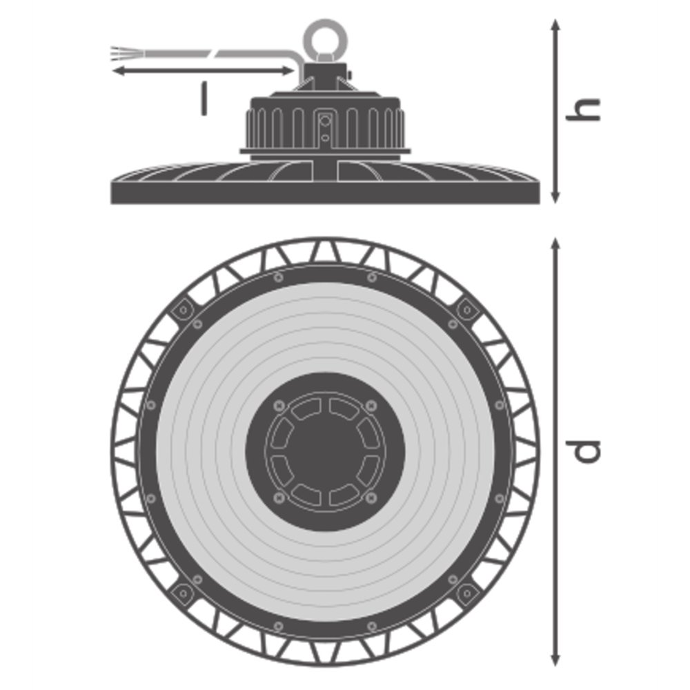 High-bay svietidlá až 15 lm/W a atraktívnym UGR. Vlastnosti výrobku: Rôzny svetelný tok a vyžarovací uhol pre montážne výšky 6 - 14 m: 4 000 K alebo 6 500 K. Výhody výrobku: Vylepšené UGR v porovnaní s predchádzajúcimi generáciami, v kombinácii s reflektorom UGR ≤ 22. Vysoký merný svetelný výkon. Úspora energie až 64% v porovnaní s bežnými výškovými svietidlami. 5-ročná záruka. Optimalizovaná hmotnosť a veľkosť kvôli kompaktnosti designu. Oblasti použitia: Náhrada za svietidlá „high bay“ s obsahom ortuti alebo halogenidovej výbojky. Sklady. Logistické haly. Priemysel. Vysoký strop (napr. nákupné centrá, komplexné objekty, haly). Výbava / príslušenstvo: Priložený je montážny háčik. Montážne prvky, reflektory a žiaruvzdorné prvky sú k dispozícii ako samostatné príslušenstvo.