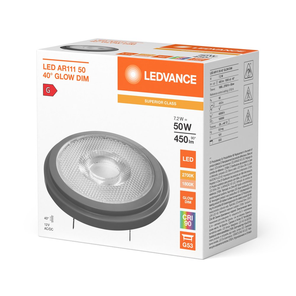 Vlastnosti výrobku Nízkonapäťové LED reflektorové svetelné zdroje AR111 s GLOWdim efektom. Vlastnosti výrobku: LED alternatíva k nízkonapäťovým halogénovým žiarivkám. Stmievateľné. Pätica: G53. Výborné podanie farieb (Ra: 97). Výhody výrobku: Vždy príjemná svetelná atmosféra vďaka zmene farby svetla od teplej bielej po extra teplú bielu pomocou stmievania. Rýchla, jednoduchá a bezpečná výmena bez prepojovania. Dizajn, rozmery, svetelný tok porovnateľné so žiarovkou alebo halogénovou žiarovkou. Nízke náklady na údržbu vďaka dlhej životnosti. Žiadne UV a nízke infračervené žiarenie vo svetelnom kuželi. Plynulé stmievanie. Veľmi vysoká kompatibilita stmievača, pozri tiež www.ledvance.com/dim. Kompatibilný s mnohými bežnými a elektronickými predradníkmi (pozri tiež compatibility list). Nižšia spotreba energie ako u žiaroviek alebo halogénových žiaroviek. Oblasti použitia: Predajne a výstavné priestory. Domáce použitie. Komerčné použitie. Zvýrazňujúce osvetlenie. Len na vnútorné použitie, nevhodné na vonkajšie použitie. Bezpečnostné informácie: Nedotýkajte sa svetelného zdroja, ak je rozbitý.. Nepoužívajte, ak je vonkajší svetelný zdroj chybný.
