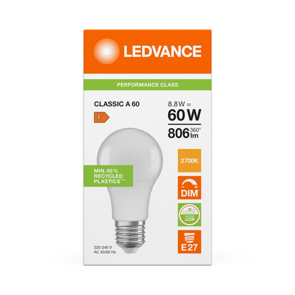 Vlastnosti výrobku LED zdroje, klasický tvar A, z recyklovaného plastu. Vlastnosti výrobku: Profesionálne LED svetelné zdroje pre sieťové napätie. Možnosť stmievania (pomocou mnohých bežných stmievačov, viď tiež www.ledvance.cz/stmivani). Minimálne 50% recyklovaného plastu (z celkovej hmotnosti plastu). Dobré podanie farieb (Ra ≥ 80) a farebná stálosť po celú dobu životnosti svetelného zdroja. Výhody výrobku: Nižšia spotreba energie ako u žiaroviek alebo halogénových žiaroviek. Vysoká stálosť farby vďaka úzkemu binningu. Jednoduchá výmena klasických žiaroviek vďaka kompaktnému dizajnu. Svetelný zdroj je vyrobený z recyklovaných plastov a prispieva k zníženiu emisií CO2 a odpadu na skládkach. Oblasti použitia: Domáce použitie. Všeobecné osvetlenie. Len na vnútorné použitie, nevhodné na vonkajšie použitie. Bezpečnostné informácie: Nedotýkajte sa svetelného zdroja, ak je rozbitý.. Nepoužívajte, ak je vonkajší svetelný zdroj chybný.