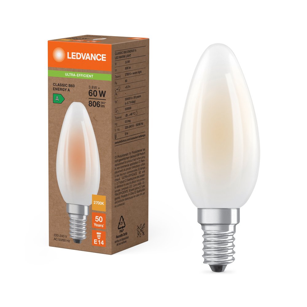Vlastnosti výrobku LED svetelné zroje, klasický tvar sviečky, TRIEDA ENERGETICKEJ ÚČINNOSTI A. Vlastnosti výrobku: LED svetelné zdroje pre sieťové napätie. Svetelný výkon: až 210 lm/W. Vyžarovací uhol: až 300 °. Veľmi dlhá životnosť až 50 000 h. Veľmi vysoký počet spínacích cyklov 500 000. Výhody výrobku: Svetelné zdroje s inovatívnou „filamentovou“ technológiou LED. Nízka spotreba energie. Dizajn, rozmery, svetelný tok porovnateľný s halogénovou žiarovkou. Okamžite 100% svetla, bez nábehu. Nízke blikanie. Oblasti použitia: Dokonalé pre ozdobné inštalácie. Domáce použitie. Všeobecné osvetlenie. Len na vnútorné použitie, nevhodné na vonkajšie použitie. Bezpečnostné informácie: Nedotýkajte sa svetelného zdroja, ak je rozbitý.. Nepoužívajte, ak je vonkajší svetelný zdroj chybný.