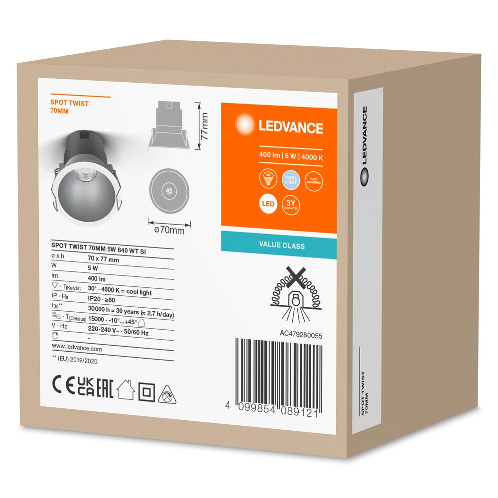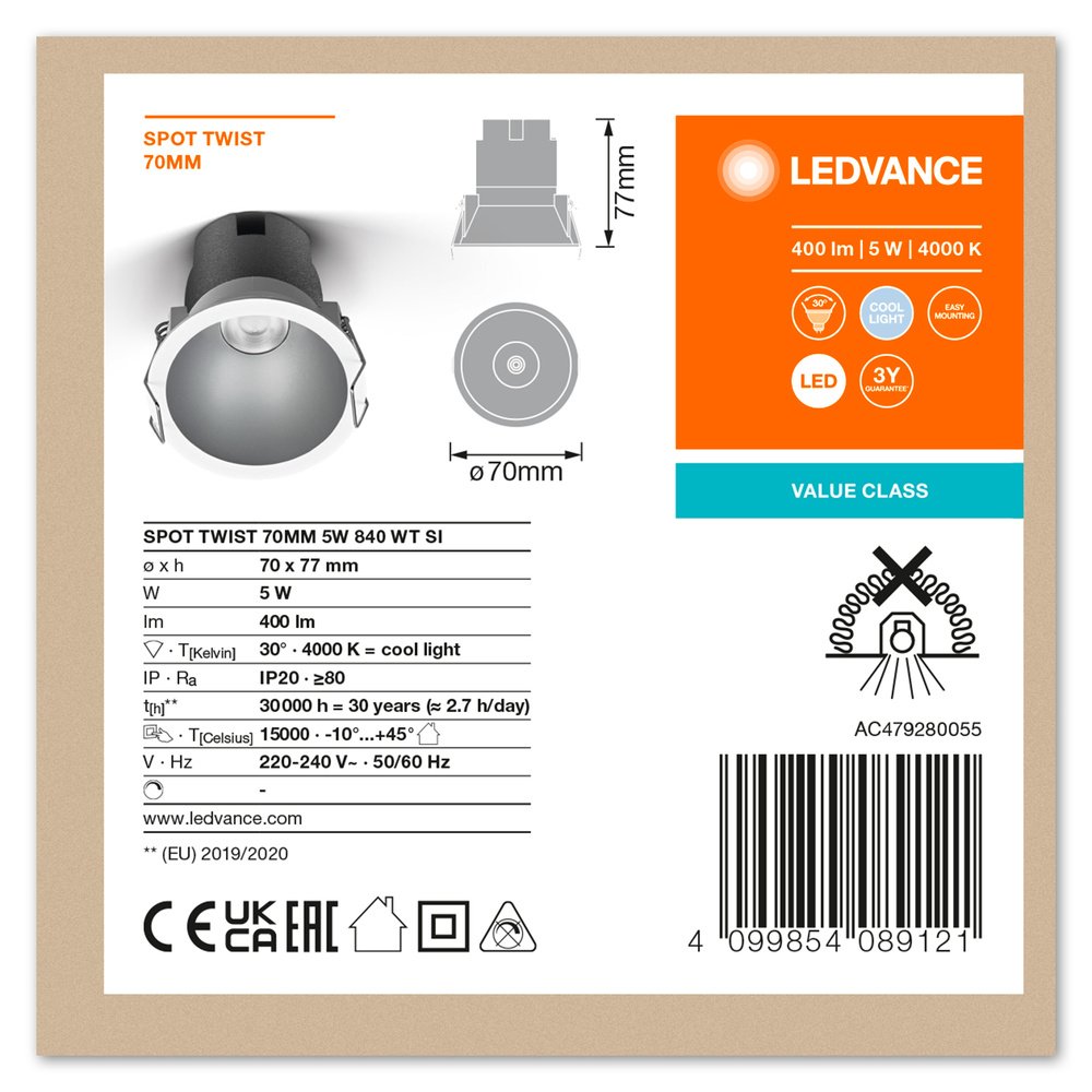 LED SPOT RECESS TWIST PRO 70mm 5W 4000K White Silver