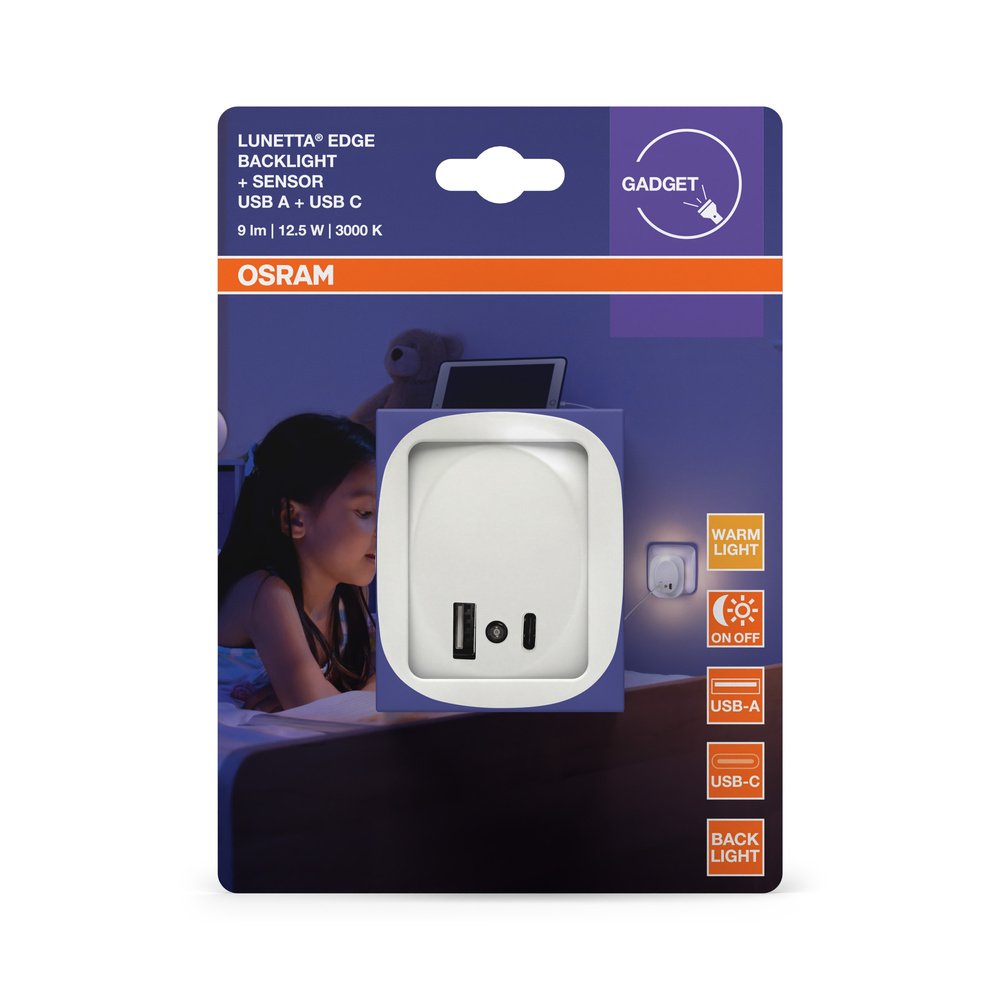 Zásuvkové nočné svietidlo s USB zásuvkou typu A a C a senzorom denného svetla.
