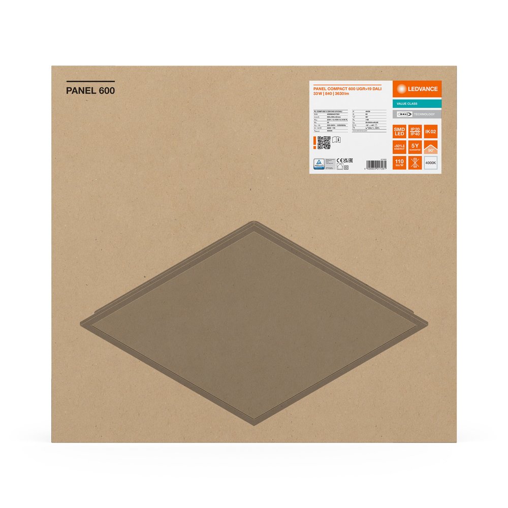 Štvorcové vstavané panelové svietidlo s nízkym oslnením, pre stropné systémy 600 x 600 mm a dopĺňa DALI-2. Vlastnosti výrobku: Vhodné pre núdzové inštalácie s centrálnou batériou podľa EN 60598-2-22. Funkcia Push DIM pre sťahovanie a spínanie priamo na tlačidlo. Rám z pretlačeného hliníka. Polystyrénový difúzor. Životnosť (L80/B10): až 50 000 h (pri 25 °C). Výhody výrobku: Spoľahlivá redukcia oslnenia (UGR < 19). Svetlo s odovzdaním blikania vďaka špeciálnemu predradníku. Externý predradník pre dodatočnú flexibilitu a jednoduchú inštaláciu. Vhodné pre núdzové osvetlenie. 5-ročná záruka. Oblasti použitia: Priama náhrada za svietidlá so žiarivými svetlami. Kancelárie, konferenčné miestnosti. Recepcia, vstupné haly, chodby, výťahy. Vhodné pre systémy zapustených svetiel do stropov o veľkosti rozmerov 600 × 600 mm. Výbava / príslušenstvo: K dispozícii je príslušenstvo pre niekoľko spôsobov montáže. Priložené je bezpečnostné lanko pre svietidlo. Predinštalované bezpečnostné držiaky. Vrátane externého predradníka. Vhodné na použitie so samostatným núdzovým modulom. Samostatne k dispozícii konektorový box s 5-pólovou svorkou pre priechodnú kabeláž pre prierezy káblov do 2,5 mm².