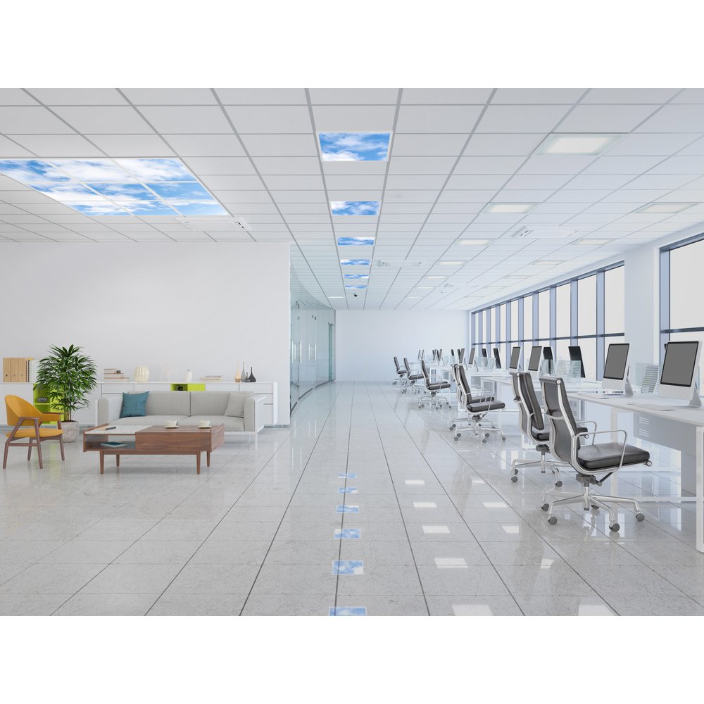Panelové svietidlá s realistickou potlačou oblohy pre stropné systémy 600 x 600 mm. Vlastnosti výrobku: Extrudovaný hliníkový rám, kovové púzdro. Farebný lakovaný polystyrénový difúzor. UGR ≤ 22 s vyžarovacím uhlom 120°. Životnosť (L80/B10): až 50 000 h (pri 25 °C). Výhody výrobku: Vzbudzuje v budovách dojem oblohy. Svetelný strop vytvára upokojujúcu atmosféru. K dispozícii ako jeden panel alebo ako sada 6 alebo 9 panelov. Iné obrázky, prispôsobené vzory a logá na vyžiadanie. Externý vodič s voliteľným 3-pólovým priechodným káblom. K dispozícii je prevedenie s DALI EKG. Oblasti použitia: Vhodné pre systémy zapustených svetiel do stropov o veľkosti rozmerov 600 × 600 mm. Salóniky, recepcia, vstupné haly, chodby, výťahy. Dekoratívne osvetlenie. Výbava / príslušenstvo: K dispozícii je príslušenstvo pre niekoľko spôsobov montáže. Priložené je bezpečnostné lanko pre svietidlo. Predinštalované bezpečnostné držiaky. Vrátane externého predradníka. Bezpečnostné informácie: Jednotlivé vzory môžu mať vplyv na vnímaný index podania farieb, teplotu chromatickosti a svetelný tok.