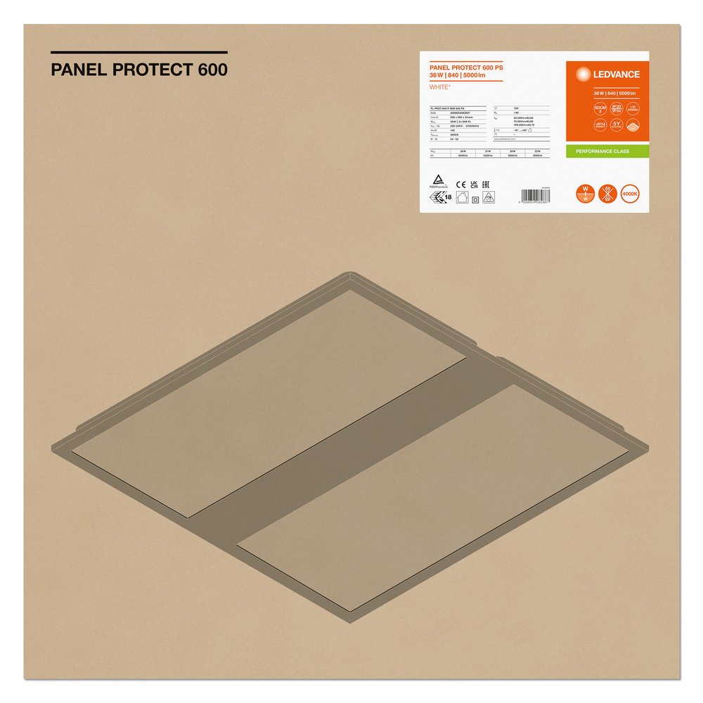 Štvorcové vstavané panelové svietidlá s krytom IP54 a funkciou power select (PS), 600 x 600 mm. Vlastnosti výrobku: Typ krytu: IP54 (predná strana), IP20 (zadná strana). Oceľové puzdro s priehlbinou na zadnej strane pre vodiča s maximálnou výškou 34 mm. PMMA difúzor. 5-pólová svorkovnica, prierez kábla do 5 x 2,5 mm². K dispozícii sú verzie svietidiel s ovládačom DALI-2 pripraveným na IoT. Životnosť (L90/B10): 50 000 h (pri 25 °C). Panel je možné na individuálne prianie upraviť optické senzory. Výhody výrobkov: Vhodné na použitie v aplikáciách, kde je potrebné vyššie pokrytie IP. Vysoko univerzálna vďaka voliteľnému výkonu (Power Select - PS) na driveri a až 5040 lm. Elektrické prepojenie bez použitia náradia vďaka zasúvaciemu konektoru. Možnosť priechodnej kabeláže pomocou dodanej pripojovacej krabice. Energeticky úsporné vďaka vysokej účinnosti systému: až 140 lm/W. Vysoká farebná predpoklada s SDCM 3. V prevedení s DALI sú k dispozícii rozšírené služby ako napr. sledovanie spotreby energie a diaľková údržba. Externý predradník pre dodatočnú flexibilitu a jednoduchú inštaláciu. Čistiteľná predná strana Ľahko ľahkému PMMA povrchu difúzora. Vhodné pre batériové núdzové inštalácie podľa EN 60598-2-22. Samostatné núdzové osvetlenie je možné pomocou dostupného núdzového Conversion Boxu LEDVANCE. 5-ročná záruka. Oblasti použitia: Priama náhrada za svietidlá so žiarivými svetlami. Vhodné pre systémy zapustených svetiel do stropov o veľkosti rozmerov 600 × 600 mm. Nemocnice. Laboratóriá. Kuchyne, jedálne, pracovné priestory. Výbava / príslušenstvo: K dispozícii je príslušenstvo pre niekoľko spôsobov montáže. Predinštalovaná pripojovacia krabica s 5-pólovou svorkou. Priložené je bezpečnostné lanko pre svietidlo. Predinštalované bezpečnostné držiaky. Vrátane externého predradníka. Vhodné na použitie so samostatným núdzovým modulom. Špeciálny montážny rám s celkovou celkovou dĺžkou iba 50 mm je k dispozícii samostatne.
