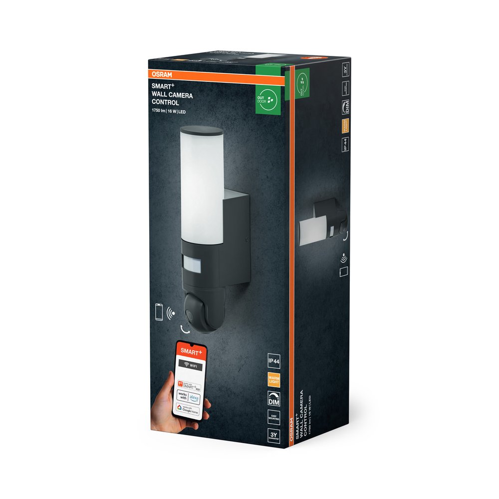 Tenké nástenné svietidlo s nastaviteľnou kamerou, reproduktorom, snímačom pohybu a denného svetla