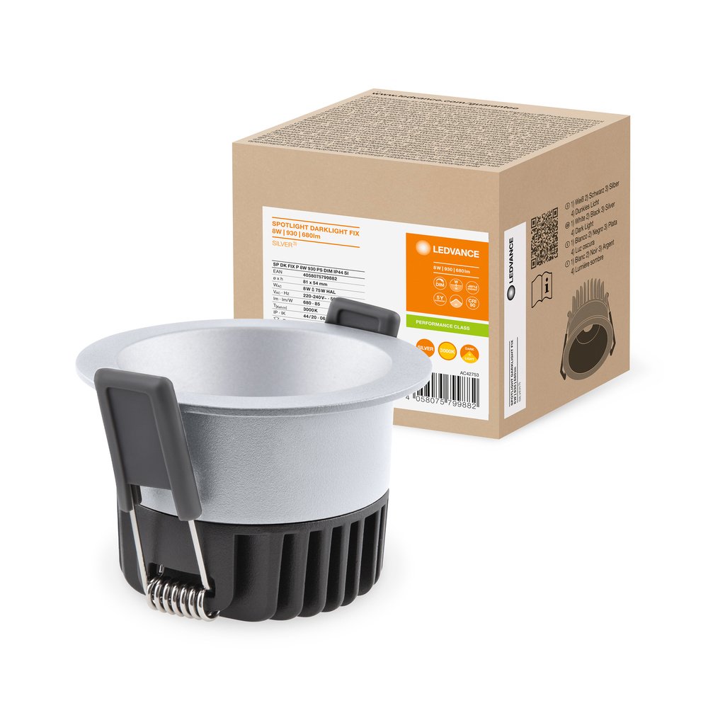 Zapustené bodové svietidlo s vylepšeným svetelným komfortom proti oslneniu UGR<19, pevné. Vlastnosti výrobku: Index podania farieb Ra: 90. Typ krytu: IP44 (na stranu miestnosti). Uhol lúča: 36°. Telo z tlakovo liateho hliníka. Pružiny chránenou podložkou. Možnosť stmievania (pomocou mnohých bežných stmievačov, tiež www.ledvance.cz/stmivani). Možnosť káblového pripojenia. Výhody výrobku: Ztemnené svetlo: Špeciálna konštrukcia pre zvýšený komfort svetla s nízkym oslnením. Neviditeľný vzhľad vďaka extra malému rámčeku. Výber: Nastavenie výkonu jasu pomocou dip prepínačov na driveri. Jednoduchá výmena externého predradníka vďaka vidlici s bajonetom. Jednoduchá inštalácia a elektrické pripojenie pomocou elektrického konektora bez použitia náradia. SCALE Design - skvelý vzhľad, vhodné materiály a malé rozmery sa hodia do každého okolia. 5-ročná záruka. Oblasti použitia: Priama náhrada za zapustené bodové svietidlá s halogénovými žiarovkami. Všeobecné osvetlenie. Hotelové izby a chodby. Bary, reštaurácia. Zvýrazňujúce osvetlenie. Galéria, múzeá. Obytné interiéry. Výbava / príslušenstvo: Príslušenstvo dodávky je externý ovládač s prepínačmi pre výber CCT a výkon pre nastavenie počas inštalácie. Renovačné krúžky sú k dispozícii ako príslušenstvo. Vybraný driver DALI 2.0 dostupný ako príslušenstvo. Bezpečnostné informácie: Všetky elektrické pripojenia musia spĺňať kvalifikovaná osoba.. Pozor – nebezpečenstvo úrazu elektrickým prúdom.. Svietidlá nie sú vhodné na pokrytie tepelne izolačným materiálom.