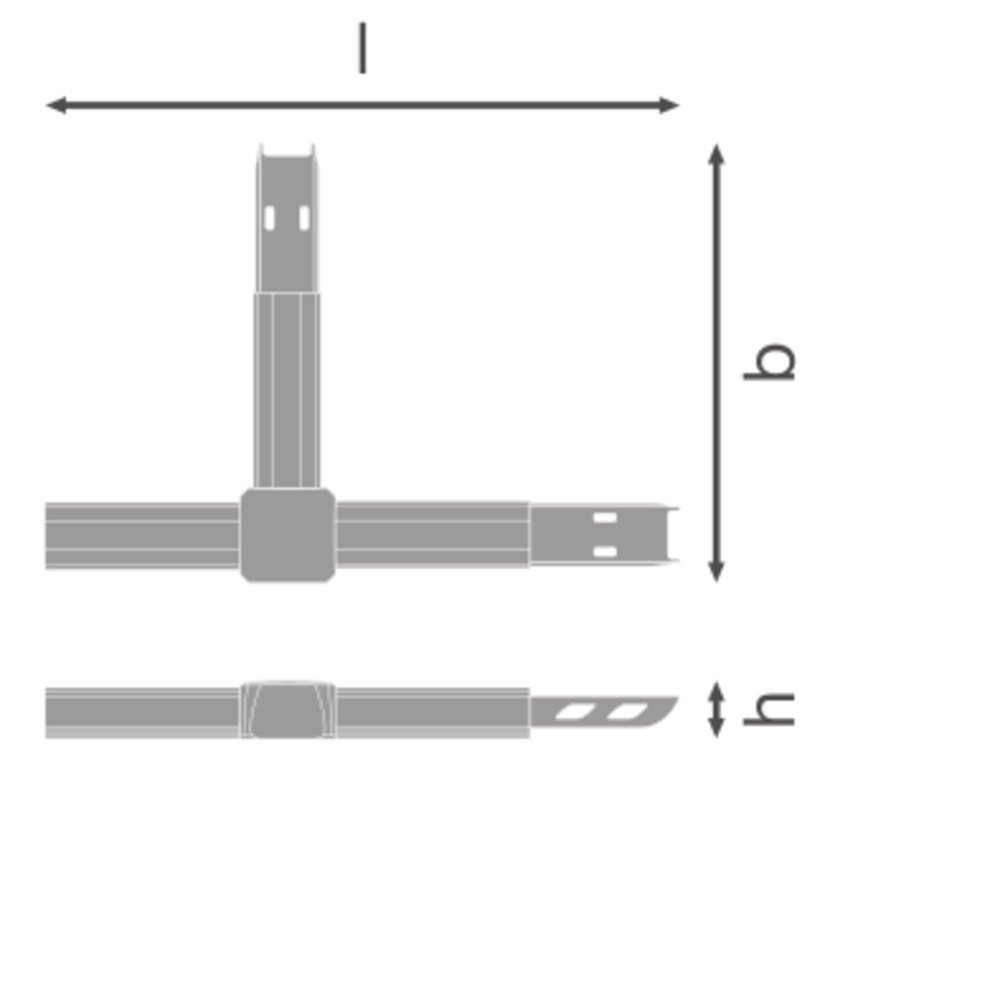 Lištová spojka v tvare T pre rohy. Vlastnosti výrobku: Priechodný s 5- alebo 8-žilovým káblom. Spojovací konektor sa skladá z aspoň jedného napájača a jedného výstupu s priechodným zapojením. Telo z oceľového plechu. Výhody výrobku: Jednoduchá inštalácia.